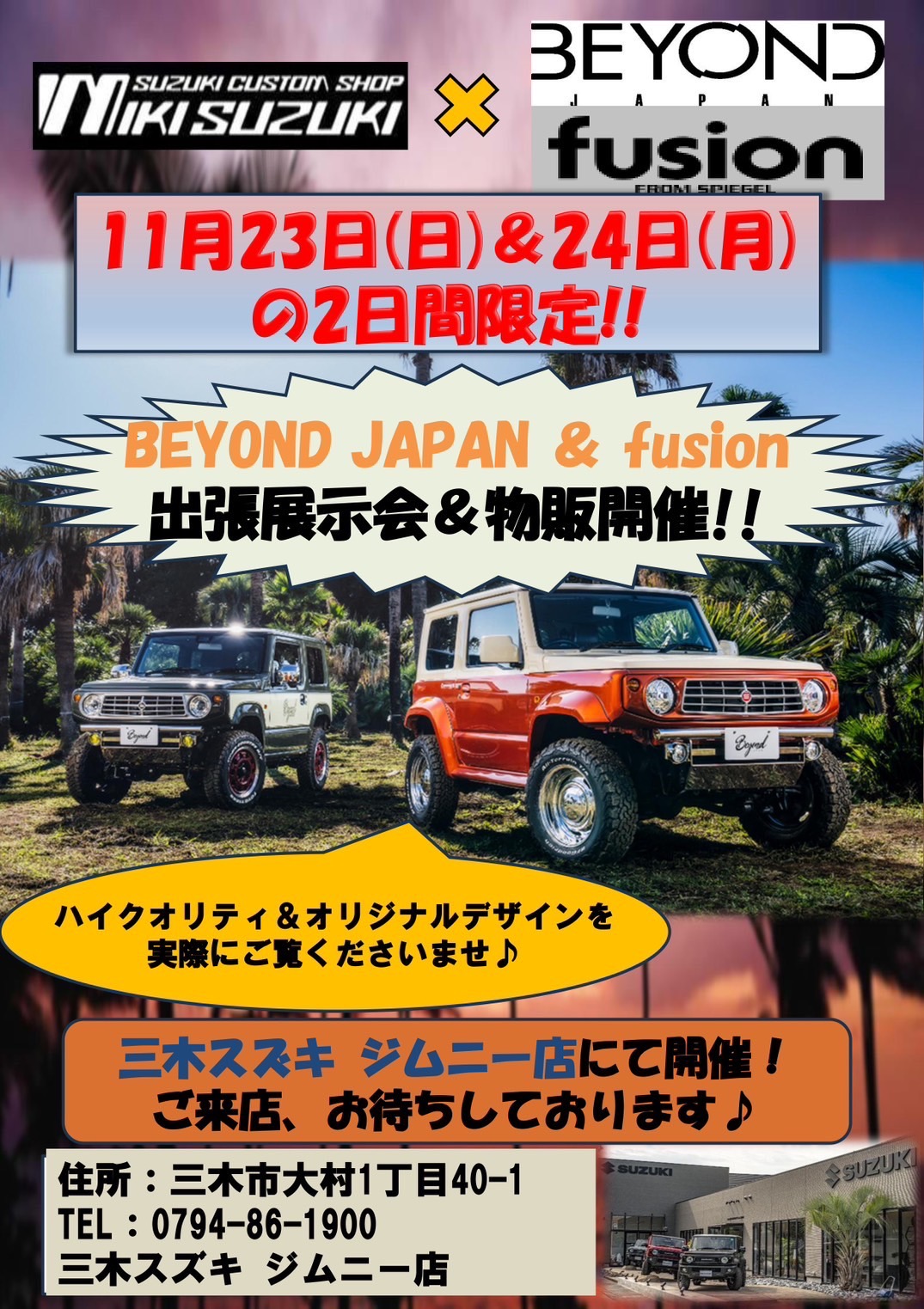 ジムニーのオリジナルパーツで人気の“BEYOND JAPAN &fusion”が三木スズキでデモカー展示と物販をしてくれるイベントを開催します
