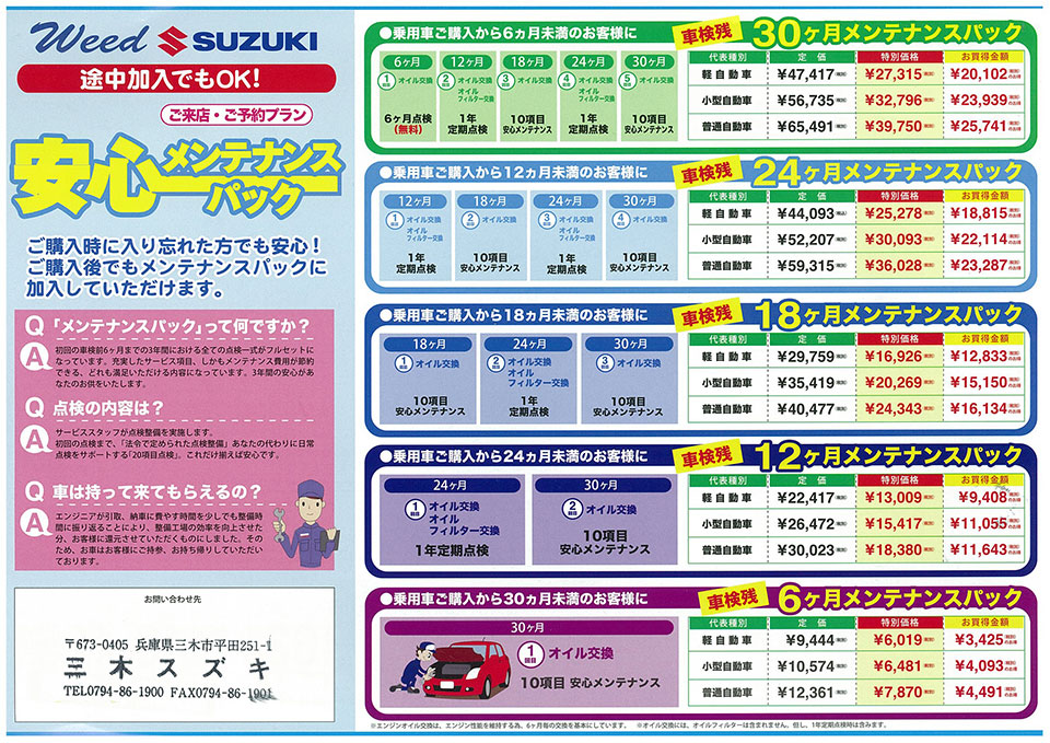 車は走行するにしたがい部品の劣化や摩耗などが進みます。三木スズキは専門の整備スタッフがお客様の愛車の健康状態をチェックいたします。 これは大きなトラブルや余分な出費を防ぎ、愛車を長く安心してお乗り頂くために大変重要なことです。 また車検・整備、鈑金・塗装、カスタムのご提案まで幅広く皆様のご要望にお応えします。 もちろん三木スズキでご購入の中古車も完全整備をおこない納車、各種報償サービスもご用意しております。ぜひご相談ください。
